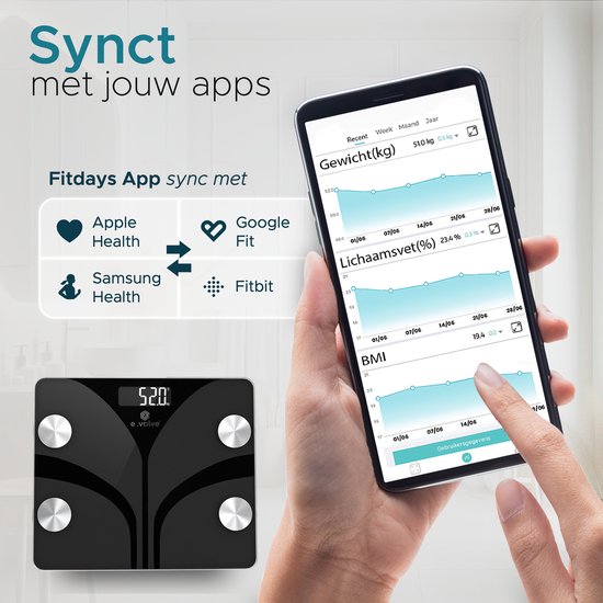 Erreichen Sie jetzt Ihre Fitnessziele! Die e.volve Personenwaage bietet bis zu 20 detaillierte Messwerte, die Ihre Fitness auf einen Blick klar und präzise anzeigen. Speichern Sie die Messergebnisse mit der App, in der Sie Ihre Fortschritte, z. B. in Bezug auf Fettanteil, Herzfrequenz, Gewicht, Muskelmasse und mehr, ganz einfach verfolgen können! Unsere App lässt sich mit Gesundheits-Apps auf iPhone, Samsung und Fitbit synchronisieren.