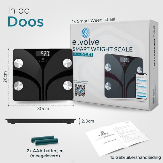 - Inhalt: 1 x e.volve Personenwaage, 2x Batterien, 1 x Bedienungsanleitung