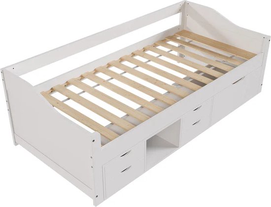 Sind Sie auf der Suche nach einem eleganten und praktischen Kinderbett Nalu 90 x 200 cm (weiß) mit Lattenrost und Stauraum? Dieses Bett hat eine großzügige Liegefläche und ist sowohl für Kinder als auch für Jugendliche ideal und kann auch als bequemes Gästebett dienen. Besonders praktisch sind die fünf eingebauten Schubladen und das Staufach, die zusätzlichen Stauraum bieten und für Ordnung im Zimmer sorgen. Dank seines zeitlosen Designs lässt sich dieses Stauraumbett perfekt in jede Einrichtung integrieren.