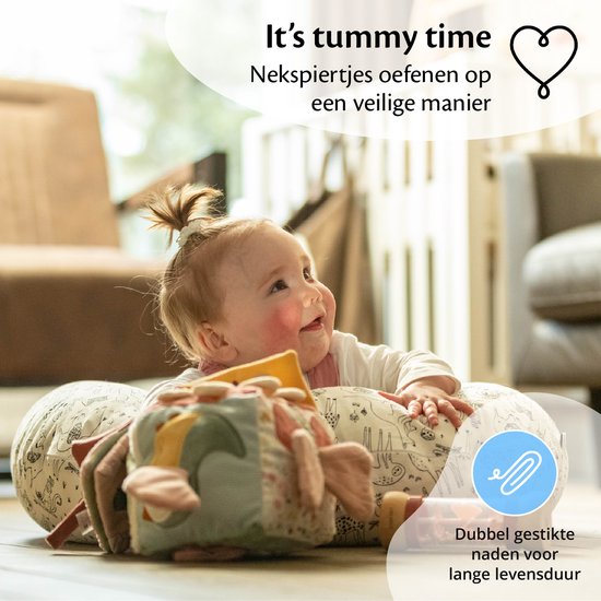 Das Ella Stillkissen ist ein vielseitiges Hilfsmittel, das mit Ihrem Baby mitwächst. In der ersten Phase können Sie Ihr Baby während des Mittagsschlafs darauf ruhen lassen. Wenn Ihr Kind etwa 6 Monate alt ist, können Sie es auch während der Bauchzeit verwenden, um die Nacken- und Bauchmuskulatur zu stimulieren. Wenn Ihr Kind 9 Monate alt ist, bietet das Kissen Unterstützung, um das Sitzen auf sichere Weise zu üben. Das Kissen sorgt dafür, dass es im Falle eines Sturzes schön weich auf die Seite fallen kann.