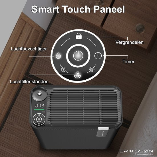 ErikssØn Luftreiniger mit Luftbefeuchter - Luftreiniger - 330 m3/h - Wirkt gegen Hausstaubmilben, Heuschnupfen, Allergie, Staub - Mit Hepa-Filter - 3 Modi + Schlafmodus - Luftqualitätsanzeige - Saubere Luft