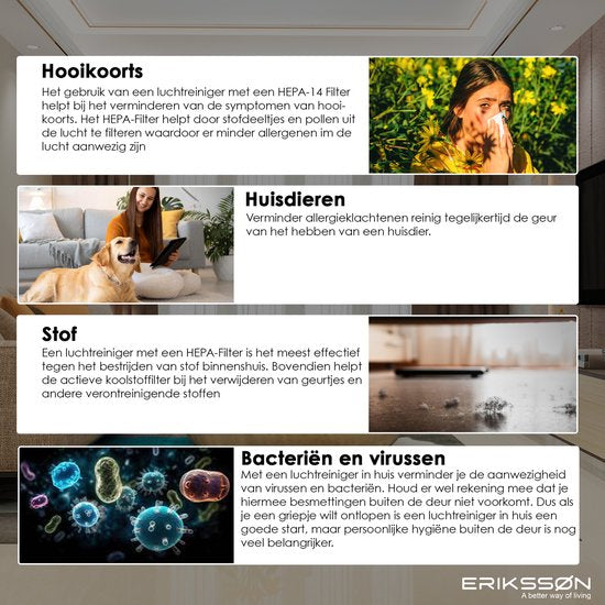 Hausstaubmilben gibt es in jedem Haushalt. Leider löst warmes Waschen dieses Problem nicht. Ein Luftreinigermit einem HEPA-Filter kann eine Lösung bieten. Da der Erikssøn Air Pure Pro über einen HEPA-14 Filter verfügt, entfernt er Hausstaubmilben, Staub und Allergene noch besser als vergleichbare Luftreiniger. -