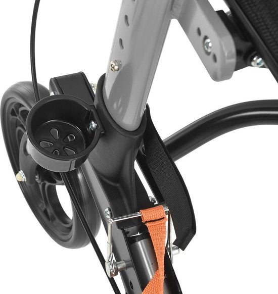 Der Rollator wird mit einer praktischen Tasche für Einkäufe oder andere Gegenstände geliefert. So müssen Sie sich keine Sorgen um Ihre Einkäufe machen und können diese bequem nach Hause tragen. Eine Gehstockhalterung vervollständigt die Ausstattung des Rollators.