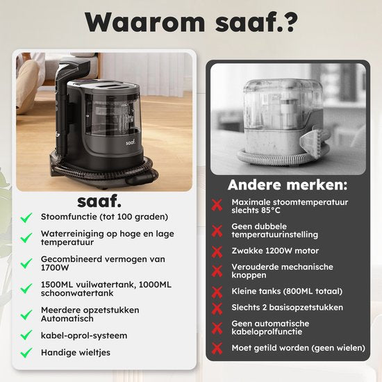 Der Saaf Fleckenreiniger macht die Reinigung einfacher und effizienter dank seiner starken Leistung und verschiedenen Aufsätzen. Bestellen Sie Ihren Saaf Fleckenreiniger noch heute. Mit einer 100% Kundenzufriedenheitsgarantie und einer 30-tägigen Bedenkzeit können Sie mit großem Vertrauen kaufen. Zögern Sie nicht mit dem Kauf und entdecken Sie den Komfort der einfachen Reinigung!