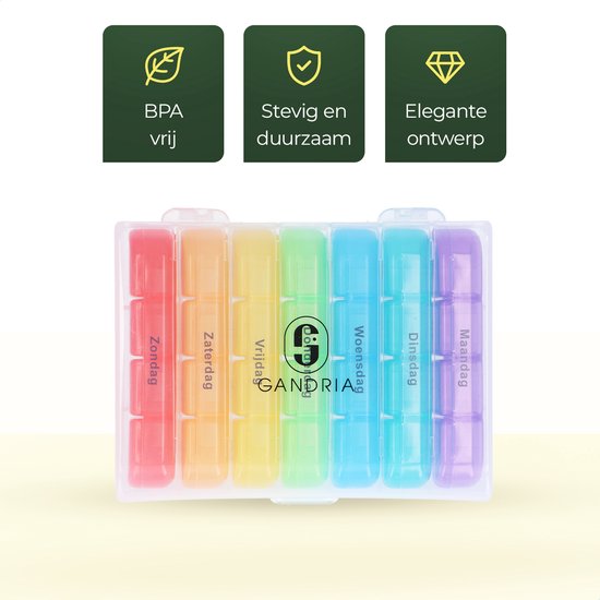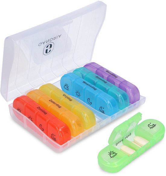 Die Gandria 7-Tage-Medikamentenbox ist die ideale Lösung für die systematische Verwaltung Ihrer Medikamente. Mit 4 Fächern pro Tag und insgesamt 28 Fächern bietet sie eine geräumige und farbenfrohe Möglichkeit, Ihre täglichen Medikamente sicher aufzubewahren.