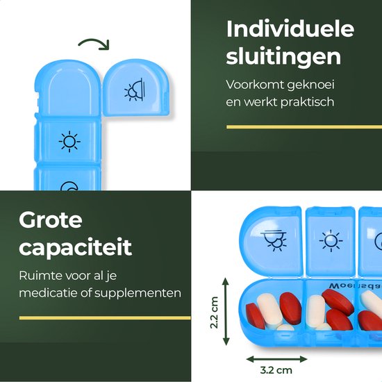 Außerdem ist diese Pillenbox mit herausnehmbaren Aufbewahrungsboxen für jeden Tag ausgestattet, so dass Sie Ihre täglichen Medikamente leicht mitnehmen können, wenn Sie unterwegs sind. Die geräumigen Fächer können auch größere Pillen aufnehmen. So bietet die Pillenbox nicht nur Ordnung und Bequemlichkeit, sondern auch die Gewissheit, dass die Medikamente immer griffbereit sind und der Zeitplan eingehalten wird, was zu einem gesunden Lebensstil beiträgt.
