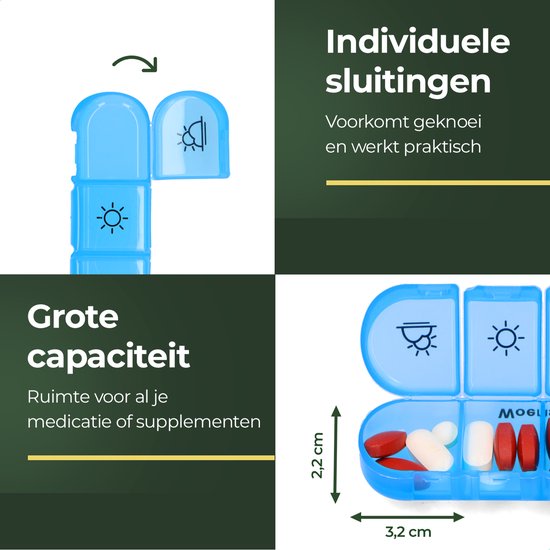 Zudem ist diese Pillenbox mit herausnehmbaren Boxen für jeden Tag ausgestattet, so dass Sie Ihre täglichen Medikamente leicht mitnehmen können, wenn Sie unterwegs sind. Die geräumigen Fächer bieten sogar Platz für größere Pillen. Diese Pillenbox bietet nicht nur eine strukturierte Organisation und Bequemlichkeit, sondern auch die Gewissheit, dass Ihre Medikamente immer in Reichweite sind.