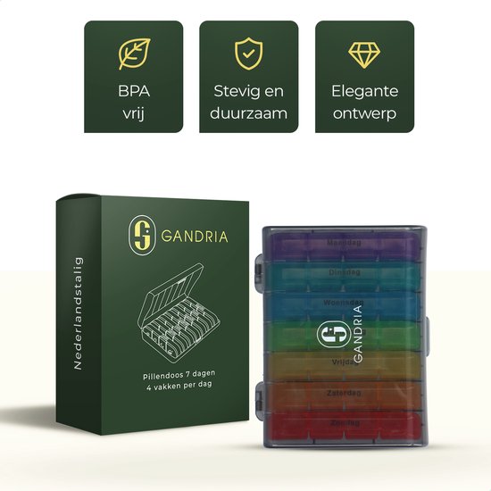 Die Gandria 7-Tage-Pillenbox hat viele Vorteile für Medikamentennutzer. Dank ihrer vier Fächer pro Tag und 28 Fächern garantiert sie eine sorgfältige Anordnung der verschiedenen Medikamente über die ganze Woche. Die Fächer sind außerdem entsprechend der Tage eingefärbt, was die Wiedererkennung und das Benutzererlebnis verbessert.