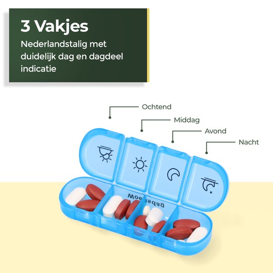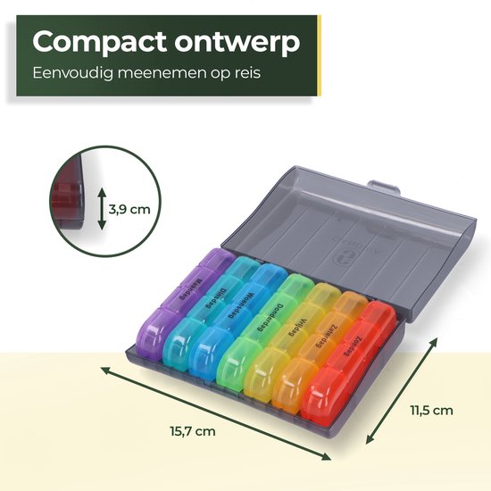 Diese Pillenbox hat den Vorteil, dass sie 7 Tage mit jeweils 4 Fächern hat, was insgesamt 28 Fächer ergibt. Das macht sie perfekt für die Verwaltung von komplexen Medikamentenregimen und täglichen Ergänzungen.