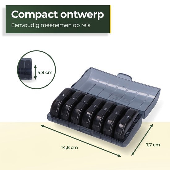Das kompakte und übersichtliche Design dieser Pillenbox macht sie praktisch zum Mitnehmen und sorgt dafür, dass Sie immer und überall leichten Zugang zu Ihren Medikamenten haben.