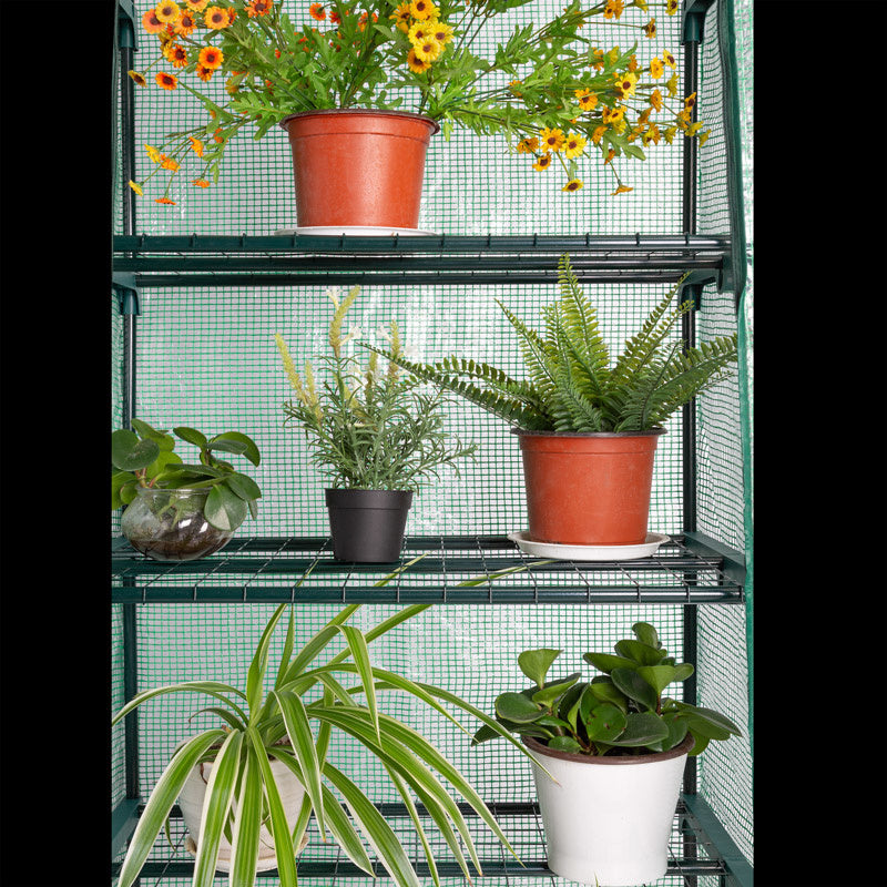 Im Inneren des Folienzeltes bieten stabile Regale Platz für kleine Pflanzen. Die Fachböden können jeweils mit bis zu 10 kg belastet werden.