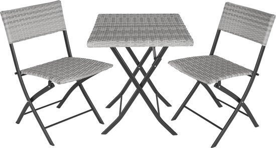 tectake - Balkon- oder Garten-Bistro-Garnitur aus Geflecht, Sitzgruppe mit 2 Stühlen und 1 kleinen Esstisch, platzsparend zusammenklappbar, Gartenmöbel, Balkonmöbel kleiner Balkon - hellgrau