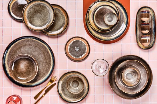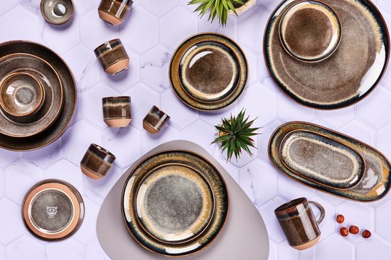 Nach einem ersten Brennen des Tons bei niedriger Temperatur werden verschiedene Farben reaktiver Glasuren auf das Steingut aufgetragen. Dadurch entsteht ein einzigartiges und lebendiges Relief. Die Farbvariationen, die von einem Stück zum nächsten zu sehen sind, sind das Ergebnis einer geschickten Kombination von Kochmethoden und dem Auftragen der Glasur.