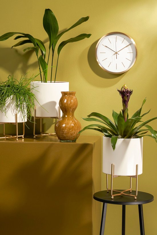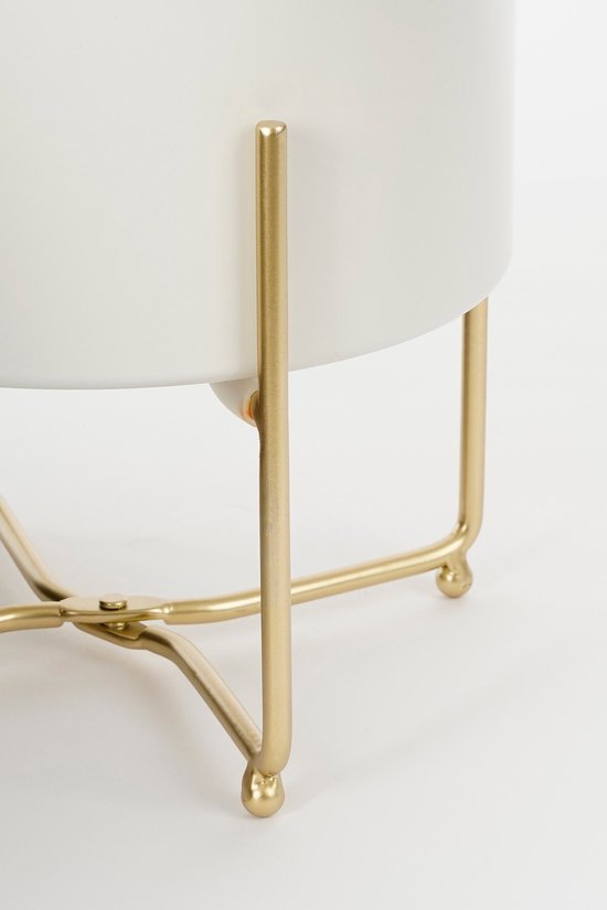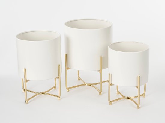 Schaffen Sie eine stimmungsvolle Pflanzenecke in Ihrem Zuhause mit diesem Set aus drei Widder-Blumentöpfen mit Ständern von Mica Decorations. Die Ständer sorgen dafür, dass die Töpfe höher stehen, was einen schönen Effekt auf jede Pflanze hat. Die Töpfe sind aus Metall gefertigt und haben eine stilvolle, weiße Oberfläche. Perfekt für jede Art von Interieur! Die goldenen Ständer verleihen einen luxuriösen Touch. Dank der unterschiedlichen Größen können Sie die Töpfe in verschiedenen Höhen aufstellen, was einen verspielten Look ergibt. Die Größen der Blumentöpfe mit Ständer sind von groß bis klein: H32 x Ø24 cm, H29 x Ø21 cm und H26 x Ø19 cm.