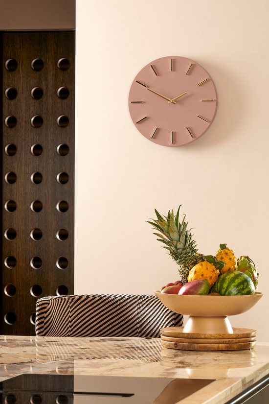 Mit der Wanduhr Brixen aus der Kollektion Mica Decorations wissen Sie immer genau, wie spät es ist. Diese Uhr ist aus Aluminium gefertigt und hat eine elegante runde Form. Der zartrosa Hintergrund bildet einen schönen Kontrast zu den goldenen Zeigern. Das Design ist modern und wirkt luxuriös! Außerdem passt die Uhr dank ihres minimalistischen Designs in jede Art von Einrichtung. Darüber hinaus verfügt die Uhr über ein praktisches Aufhängesystem für eine einfache Wandmontage. Die Uhr hat einen Durchmesser von 35,5 cm. | Bitte beachten Sie, dass diese Uhr, wie viele andere Uhren auch, eine interne mechanische Konstruktion hat, die ein Ticken erzeugt, sie ist also keine leise Uhr.