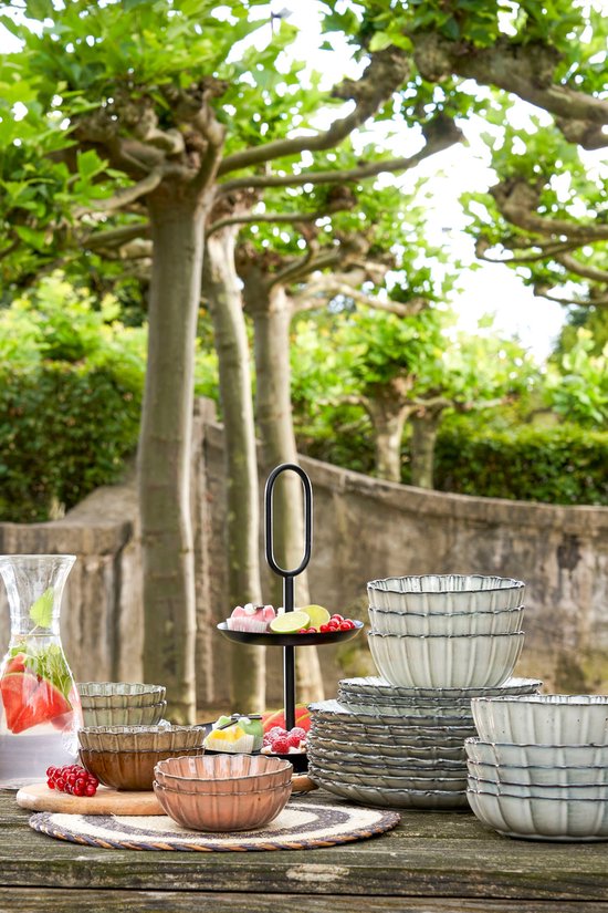 Mit der Schale Corfu von Mica Decorations servieren Sie Ihre Gerichte auf stilvolle Weise! Diese elegante, handgefertigte Schale in Grau hat einen niedrigen, dunklen Rand, der mit subtilen Bögen verziert ist und einen schönen Akzent setzt. Die Schale ist sowohl spülmaschinen- als auch mikrowellengeeignet und hat ein Fassungsvermögen von 500 ml. Die Maße sind H5 x Ø18,5 cm. Kombinieren Sie diese Schale mit anderem Geschirr aus der Korfu-Kollektion von Mica Decorations für einen schön gedeckten Tisch.