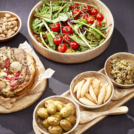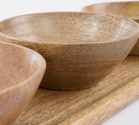 Die Servierschalen mit Tablett Tomar aus der Kollektion Mica Decorations eignen sich perfekt für die Präsentation leckerer Snacks. Die Tabletts bestehen aus 100 % FSC-zertifiziertem, natürlichem Mangoholz und haben einen schönen, hellbraunen Farbton. Sie werden als Set verkauft, bestehend aus drei kleinen Schalen und einem ovalen Tablett. Ideal zum Servieren von Tapas! Die Maße sind L35 x B12 x H5 cm.
