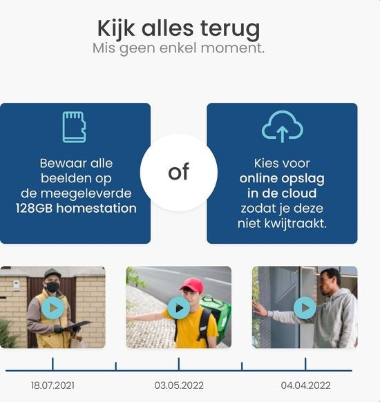 Natürlich möchten Sie die Aufnahmen Ihrer neuen Errungenschaft auch wieder ansehen können. Die Akku-Kameras von Gologi werden mit einer 132 GB großen Homestation geliefert, auf der Sie Hunderte von Stunden an Filmmaterial speichern können. Möchten Sie die Kameraaufzeichnungen lieber immer zur Hand haben? Dann können Sie sich für einen Online-Cloud-Speicher entscheiden. Auf diese Weise können Sie sich die Aufnahmen jederzeit auf Ihrem Handy oder Tablet ansehen.