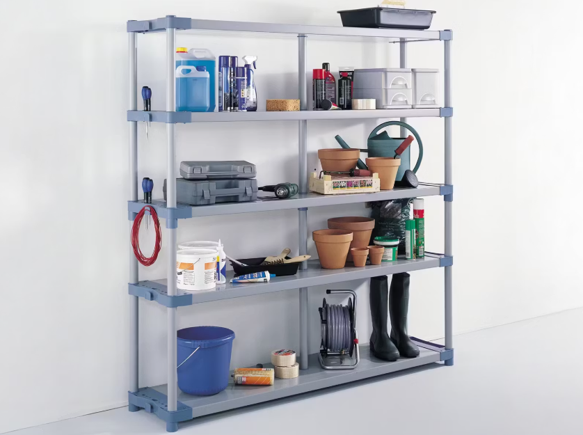 Das Regal besteht aus robusten grauen Pfosten und Einlegeböden aus Kunstharz/PVC, die mit blauen Polypropylenspitzen versehen sind. Dadurch kann das Regal eine maximale Last von 450 kg tragen, so dass Sie viele Gegenstände sicher unterbringen können.