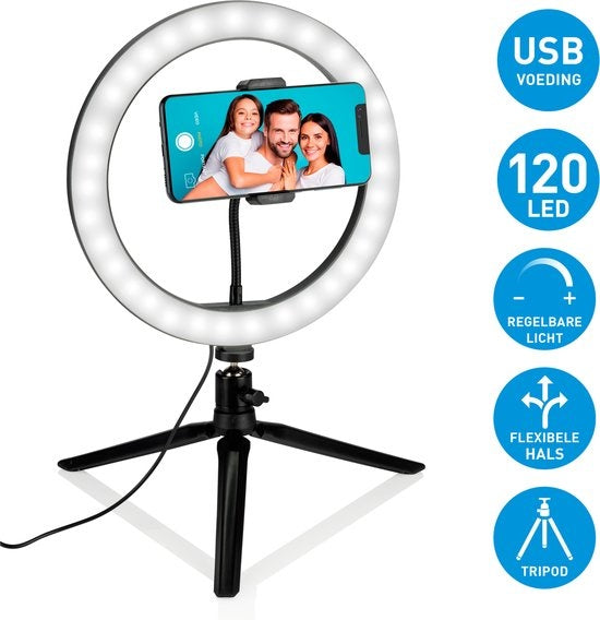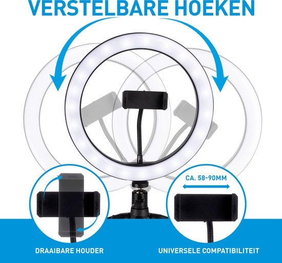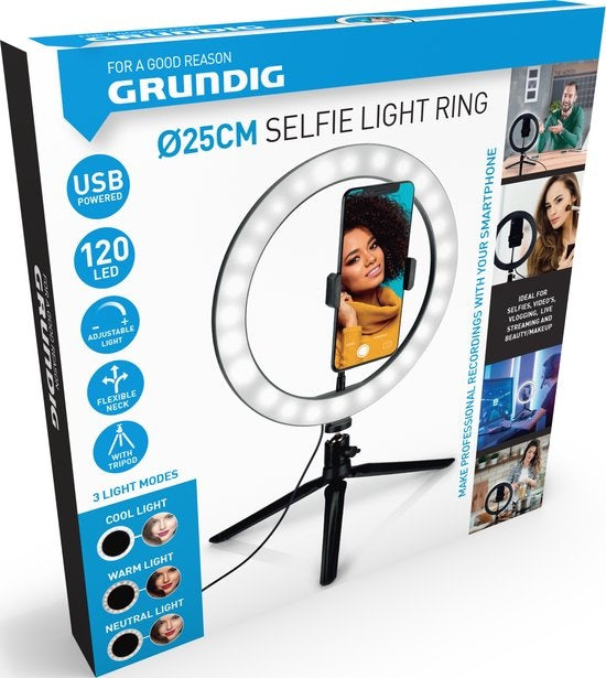 Grundig Selfie Ringlampe auf Stativ - Ringlicht - für Smartphone - Social Media und Vlogs - LED - Flexibel - 25 cm