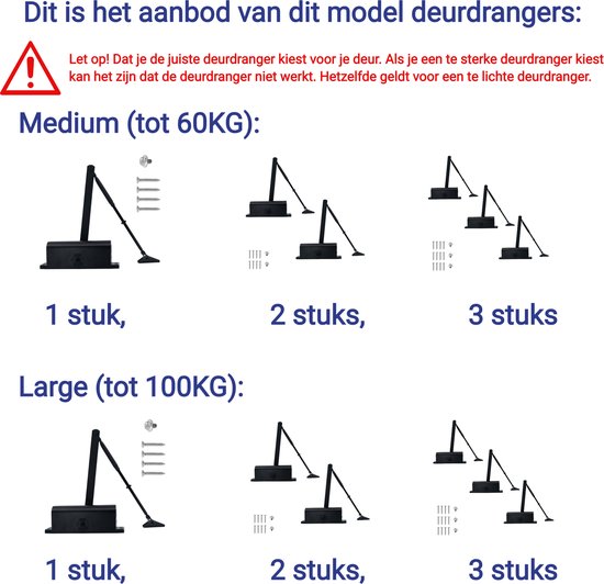 Bitte beachten Sie! Wenn Sie eine leichte Tür haben, die weniger als 60 Kilo wiegt, suchen Sie nach unserem mittleren Türschließer. Sie können diese Option unter auswählen: Wählen Sie Ihre Farbe; das ist wichtig, denn wenn dieser Türschließer mit einer leichten Tür kombiniert wird, wird er nicht richtig funktionieren.