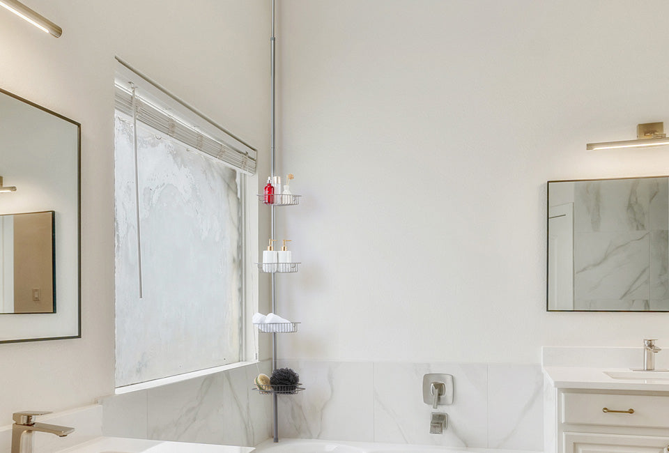 Das Duschregal ist mit einem Federsystem ausgestattet, mit dem Sie es einfach von der Duschwanne an der Decke befestigen können. Kein Befestigungsmaterial oder Werkzeugkasten erforderlich! Die Stange und die Körbe sind aus Edelstahl also keine lästigen Rostflecken nach all den Duschgängen.