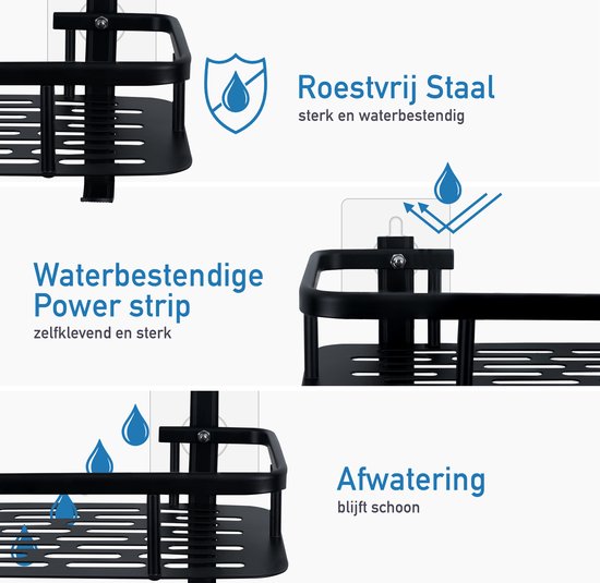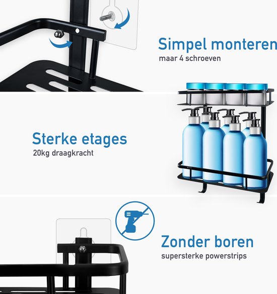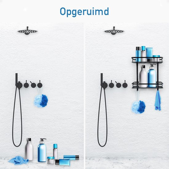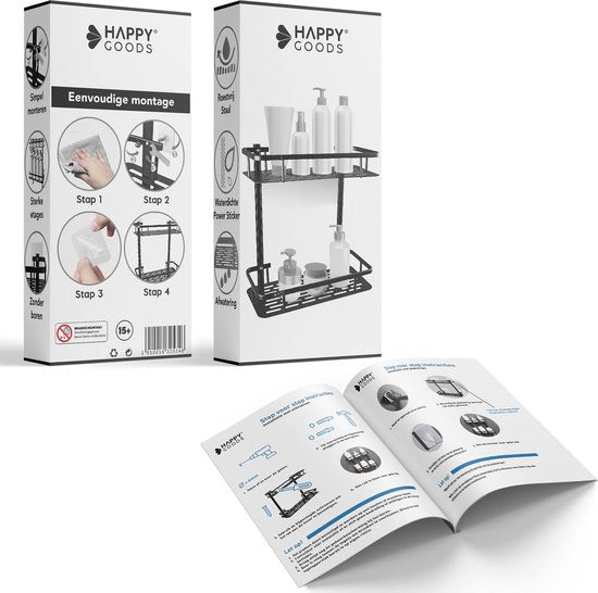 Happy Goods Duschregal - 2-lagiges Duschregal ohne Bohren - Edelstahl - Selbstklebend - Hängendes Duschregal - Badezimmerregal - Badezimmerregal - Duschregale - Schwarz