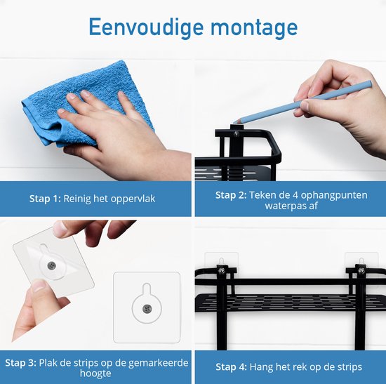 Sie wollen keine Löcher in Ihrer Wand oder gar andere Schäden? Mit den mitgelieferten leistungsstarken Steckdosenleisten können Sie Ihr Happy Goods Duschregal ohne Bohren montieren, mit der gleichen Stärke wie Schrauben, aber ohne unansehnliche permanente Löcher. Diese Stromleisten können bis zu 20 kg tragen!