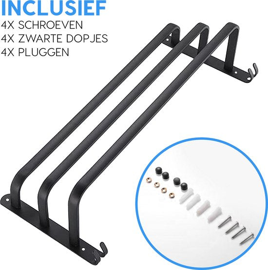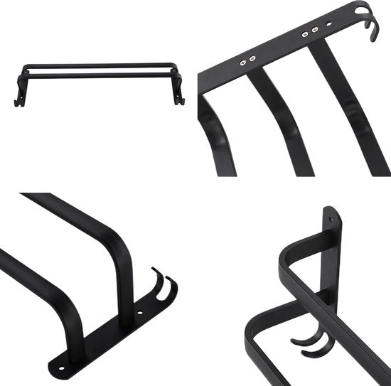 Packungsinhalt:1x Handtuchhalter schwarz, 2x Haken, 1x Satz Schrauben, 1x Satz schwarze Endkappen