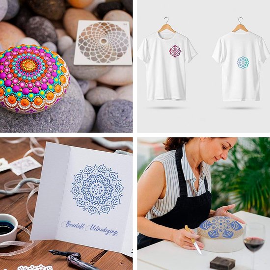 Als Mandala-Anfänger möchtest du dich natürlich zu deinen schönsten Kreationen inspirieren lassen. Die beiliegenden Mandala-Schablonen bieten Ihnen eine Reihe von kreativen Ideen in vielen verschiedenen Stilrichtungen.Verschiedene Techniken zur Gestaltung der außergewöhnlichsten Mandalas. Die Vorlagen unterstützen Sie dabei, brillante Mandala-Designs auf Oberflächen wie Stein, Papier, Textil, Leinwand, Metall oder sogar an die Wand zu malen.