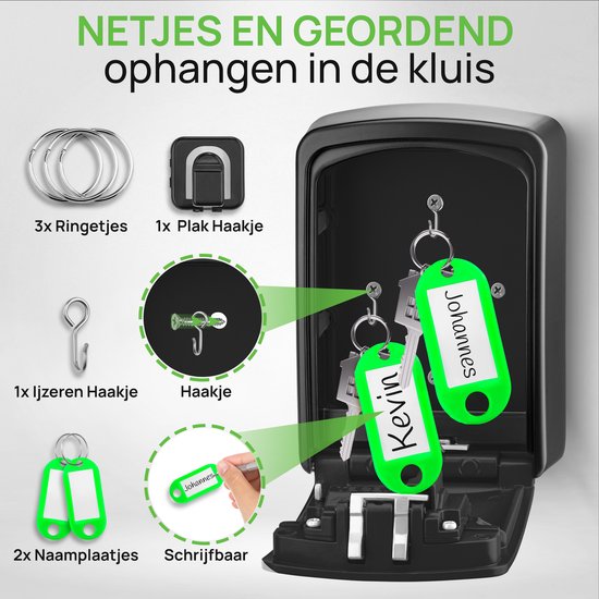 Der Happy Goods XXL-Schlüsselsafe wird noch familienfreundlicher durch Namensschilder und Ringe, die an den verschiedenen Schlüsselbunden angebracht werden können. Schreiben Sie die Namen der verschiedenen Familienmitglieder oder Mitbewohner auf diese Etiketten, damit Sie genau wissen, wem welcher Schlüsselbund gehört. Dies verhindert Verwechslungen zwischen den Schlüsseln und gewährleistet die Benutzerfreundlichkeit und Sicherheit des Schlosses mit Code für den Innen- und Außenbereich!