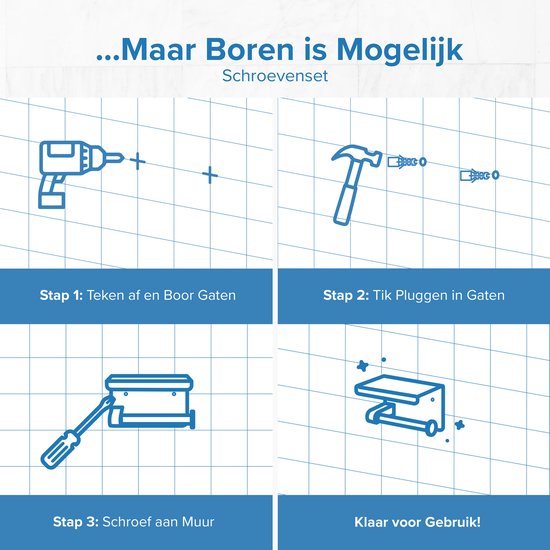 Für diejenigen, die keine Löcher bohren möchten, wird ein'Wasserfester 3M VHB Power Sticker' mit diesen Toilettenpapierhaltern mitgeliefert. Damit wird der Toilettenpapierhalter fest an der Wand fixiert. Sollten Sie dennoch lieber bohren wollen, haben wir auch daran gedacht. Wir liefern auch...und Schrauben inklusive!