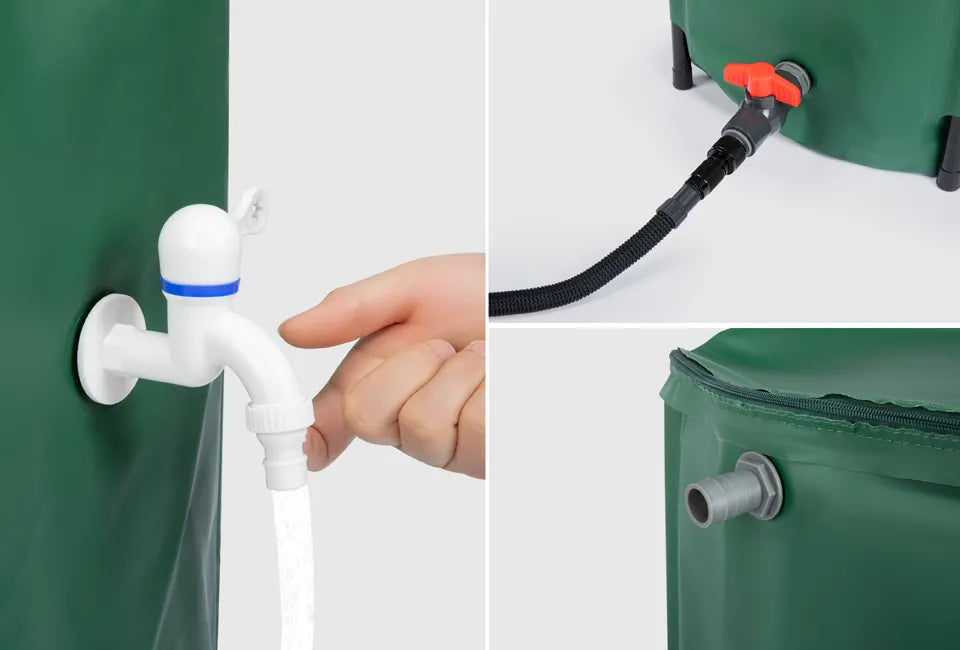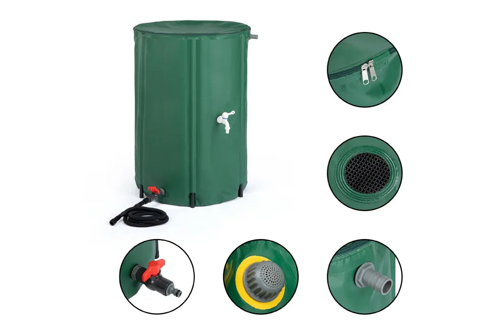 Die Tonne ist aus Wetter- und UV-beständigem Kunststoff gefertigt, der langlebig und reißfest ist. Dank seines leichten und zusammenklappbaren Designs lässt es sich im Winter leicht und ohne viel Platz zu beanspruchen. Der Reißverschlussdeckel bietet schnellen Zugang Der Reißverschlussdeckel bietet schnellen Zugang zum Wasser, während das obere Gitter Blätter und Schmutz filtert, damit das Wasser sauber bleibt.