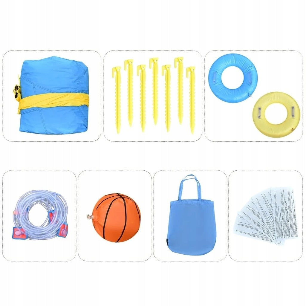 Die Hüpfburg bietet eine Reihe von Spielmöglichkeiten, darunter eine kleine Rutsche, eine Doppelrutsche, ein Schwimmbecken, einen Basketballkorb, eine Wasserkanone und eine Kletterwand. Lassen Sie sie gemeinsame Momente mit ihren Freunden genießen.