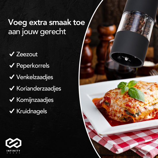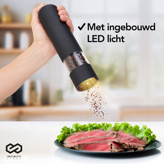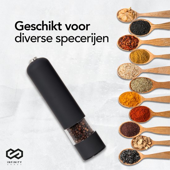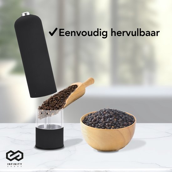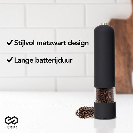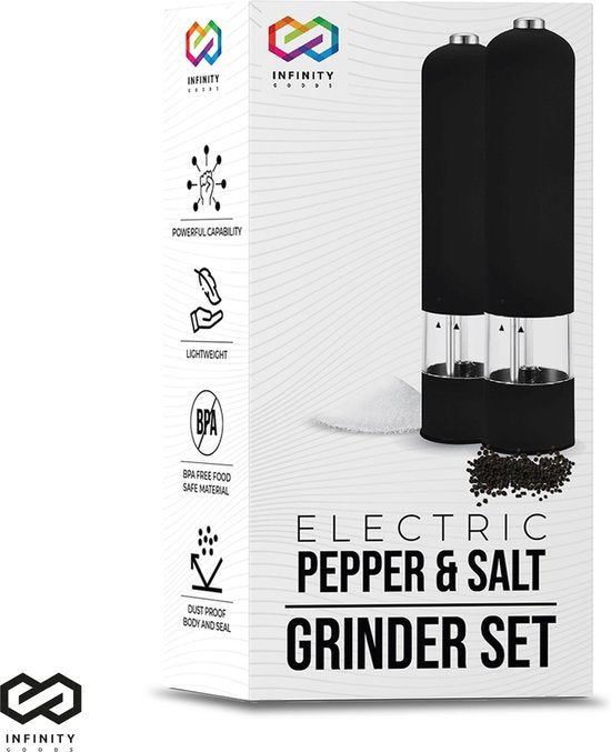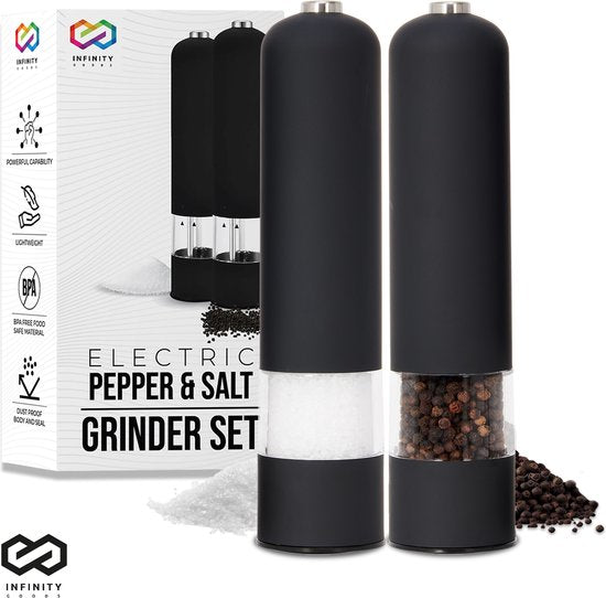 Infinity Goods Elektrisches Pfeffer- und Salzmühlen-Set - Pfeffermühle - Salzmühle - Einstellbares Mahlwerk - Gewürzmühle - Schwarz