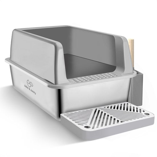 Jake und Jacky Edelstahl Katzentoilette - Katzentoilette Edelstahl - Offene Katzentoilette - Inkl. Katzentoilettenschaufel mit Halterung und Streusammelstufe - 60x40x30cm
