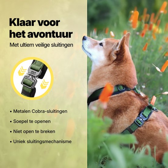 Das Geschirr verfügt über zwei Cobra-Metallschnallen mit Schnellverschluss, die mit einer Hand geöffnet werden können und weniger leicht verschleißen als andere Verschlüsse. Außerdem verfügt das Geschirr über einen D-Ring aus Metall auf dem Rücken und auf der Brust, an dem die Leine befestigt werden kann.