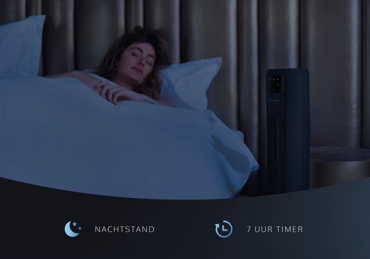 Der Turmventilator verfügt über 3 Drehgeschwindigkeiten, mit denen Sie die Intensität des Luftstroms nach Belieben einstellen können. Eine niedrige Geschwindigkeit für die Nacht, eine mittlere Geschwindigkeit und eine Turbostufe. Die Rotationsgeschwindigkeit kombinieren Sie dann mit einem Modus. Dabei können Sie zwischen einem Schlafmodus, einem normalen Modus und einem ökologischen Modus für minimalen Verbrauch wählen. Dies alles wird durch einen exklusiven Motor aus 100% Kupfer mit hoher Effizienz und Zuverlässigkeit erreicht.
