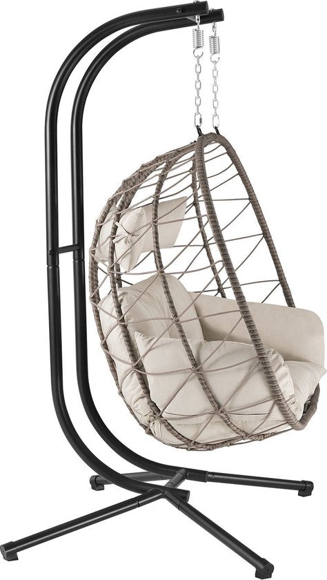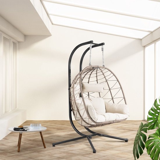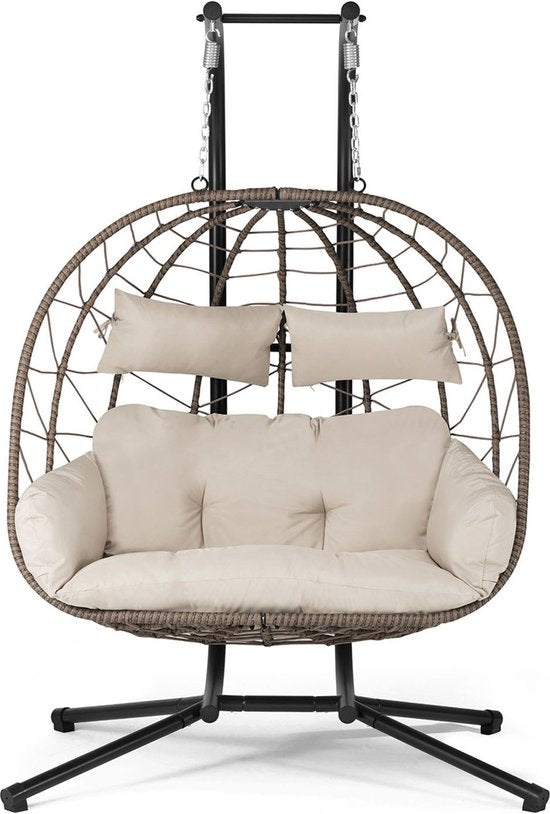 Der moderne Polyrotan-Doppelhängesessel Aria in Beige bietet eine perfekte Kombination aus entspannendem Schaukelspaß und stilvollem Lounge-Design. Ob Sie nun einen Moment für sich suchen oder zu zweit entspannen möchten: Genießen Sie den Komfort des geräumigen Hängesitzes, der mit weichen Kissen ausgestattet ist. Dieser freistehende Hängesessel mit Gestell und Federaufhängung ist sowohl für den Innenbereich als auch für den wettergeschützten Außenbereich als Gartenmöbel geeignet. Er verleiht jeder Wohnung, jedem Garten und jeder Terrasse einen stilvollen Touch. Außerdem ist er ein tolles Geburtstagsgeschenk für Kinder, Jugendliche und Erwachsene.
