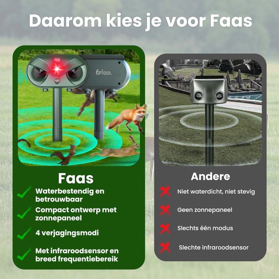 Schützen Sie Ihren Garten und Ihr Haus vor unerwünschten Schädlingen mit dem Faas Cat Repellent. Mit einer 100%igen Kundenzufriedenheitsgarantie und einer 30-tägigen Bedenkzeit können Sie beruhigt einkaufen. Zögern Sie nicht länger und entdecken Sie die Vorteile einer schädlingsfreien Umgebung!