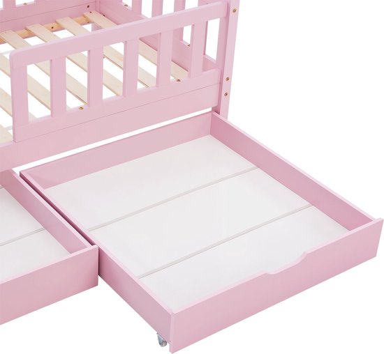 Das Kinderbett Marli (160x80 cm, rosa) mit Bettgestell, Fallschutz und Lattenrost ist ideal für Jungen und Mädchen von 3 bis 10 Jahren. Das moderne Wohnbett schmückt das Kinderzimmer und bietet einen gemütlichen Schlafplatz, Spielbett und Stauraum in einem. In dem geräumigen 2-teiligen Bettkasten lässt sich Spielzeug leicht verstauen. Die Hausoptik mit Dach bietet zudem zahlreiche kreative Möglichkeiten - als Höhle oder mit einer zauberhaften Himmelsdekoration. Mit einem zusätzlichen Gitter bietet dieses Bett auch mehr Sicherheit und Schutz für kleine Kinder. Es ist aus massivem und pflegeleichtem Kiefernholz gefertigt und somit für den langfristigen Gebrauch geeignet.