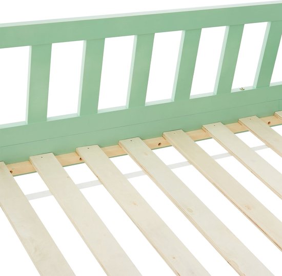 Das Kinderbett Marli (90x200 cm, mintgrün) ist mit Bettkasten, Fallschutz und Lattenrost ausgestattet und eignet sich perfekt für Jungen und Mädchen von 3 bis 10 Jahren. Verleihen Sie dem Kinderzimmer einen neuen Look mit diesem modernen Bett, das als Schlafplatz, Spielbett und Stauraum dient. In der geräumigen 2-teiligen Bettschublade lassen sich Spielzeuge von Toys & Co. leicht verstauen. Außerdem bietet das Design des Hauses mit Dach zahlreiche Möglichkeiten für lustige Kreationen - wie eine Höhle oder mit einer verträumten Himmelsdekoration. Mit einem zusätzlichen Gitter bietet das Bett außerdem mehr Schutz und Sicherheit für kleine Kinder. Aus massivem und pflegeleichtem Kiefernholz gefertigt, ist dieses Bett ideal für den langfristigen Einsatz.