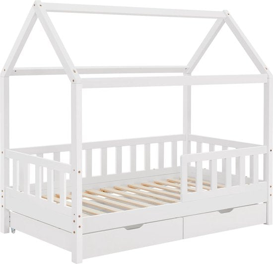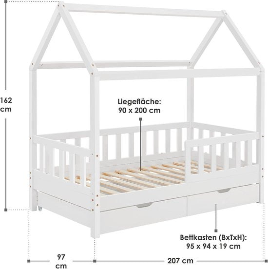Das Kinderbett Marli (90x200 cm, weiß), ausgestattet mit Bettkasten, herunterklappbarem Schutzgitter und Lattenrost, ist perfekt für Mädchen und Jungen von 3 bis 10 Jahren. Verleihen Sie dem Kinderzimmer einen modernen Look mit diesem vielseitigen Heimbett, das Schlafplatz, Spielbett und Stauraum in einem ist. In dem geräumigen 2-teiligen Bettkasten lassen sich Spielzeuge von Toys & Co. leicht verstauen. Die hausähnliche Optik mit Dach bietet zahlreiche Dekorationsmöglichkeiten - es kann als Höhle dienen oder mit einer zauberhaften Himmelsdekoration versehen werden. Mit dem zusätzlichen Gitter bietet das Bett zudem mehr Schutz und Sicherheit für kleine Kinder. Aus massivem, pflegeleichtem Kiefernholz gefertigt, ist dieses Holzbett eine ideale Wahl für den langfristigen Gebrauch.