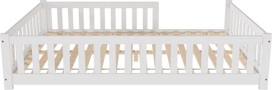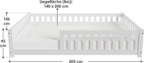 Entdecken Sie das elegante Kinderbett Naya 140x200 cm, ausgestattet mit einem Lattenrost und Fallschutz! Dieses Bodenbett für Mädchen und Jungen bietet einen sicheren und bequemen Schlafplatz, während der robuste Holzrahmen für Langlebigkeit sorgt. Das