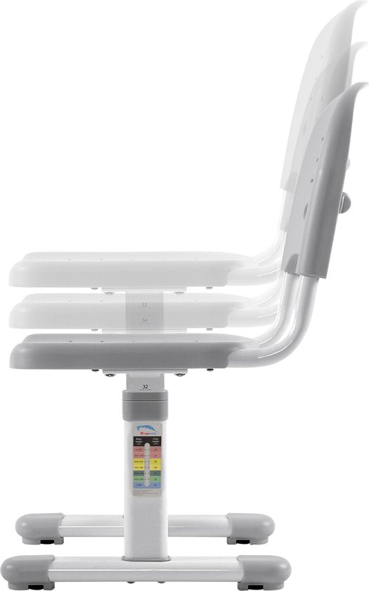 - Der Stuhl ist ebenfalls höhenverstellbar und passt sich mit einer Sitzhöhe von 32 cm bis 44 cm der Körpergröße des Kindes an.