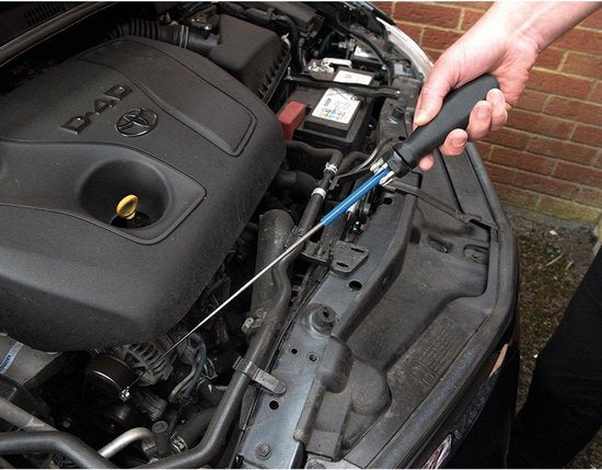 Beim Herausziehen des Schraubendrehers erscheint ein Teleskopmagnet, der bis zu 53 Zentimeter ausfahren kann. So erreichen Sie auch schwer zugängliche Stellen, wie z.B. unter der Motorhaube Ihres Autos.