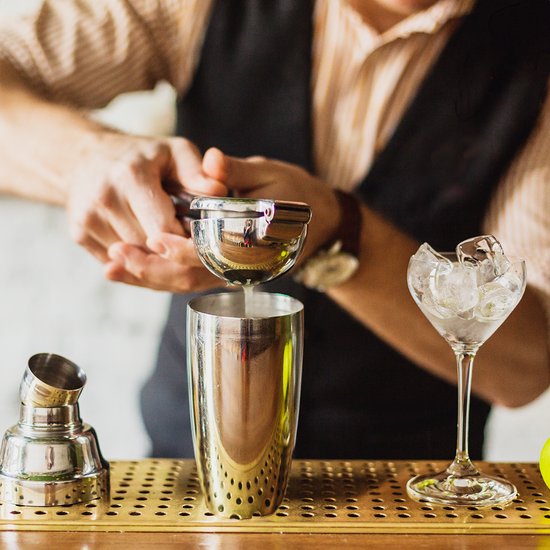 Das hochwertige 25-teilige Cocktail-Set von KitchenBrothers bietet alles, was Sie zum Mixen der köstlichsten Cocktails brauchen! Dieses Set wird in einer luxuriösen Geschenkbox mit einem praktischen Rezeptbuch geliefert. Das Set ist aus hochwertigem Edelstahl gefertigt und enthält einen Cobbler Cocktail Shaker mit einem Fassungsvermögen von 750 ml. Kurzum, es ist eine stilvolle und geschätzte Ergänzung für jede Party!