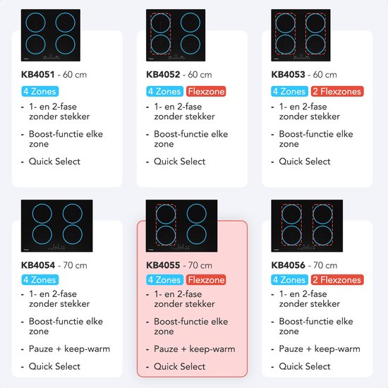 Verbessern Sie Ihre Küche mit dem KitchenBrothers Induktionskochfeld. Dieses geräumige Einbau-Induktionskochfeld verfügt über vier separate Kochzonen, die einen optimalen Kochkomfort gewährleisten. Sie möchten eine große Grillplatte verwenden? Das ist kein Problem. Sie können ganz einfach zwei einzelne Kochzonen zu einer großen Flexzone kombinieren. Schließen Sie das Induktionskochfeld einfach über das Energiemanagement für 1- und 2-Phasen-Anschlüsse an. Dieses Induktionskochfeld ist reichlich mit praktischen Zusatzfunktionen ausgestattet, wie z. B. einer Boost-Funktion, einer Warmhaltefunktion und Quick Select zum sofortigen Einstellen der richtigen Temperatur.