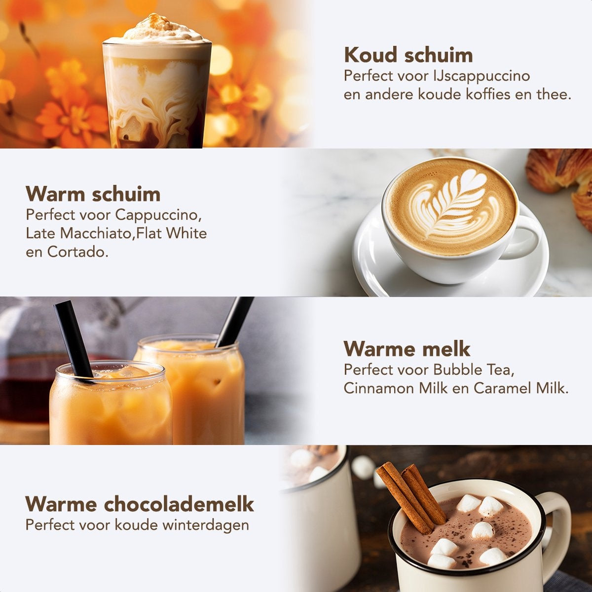 Wähle aus 4 Modi: kalter Schaum, heißer Schaum, heiße Milch und Schokoladenmilch.