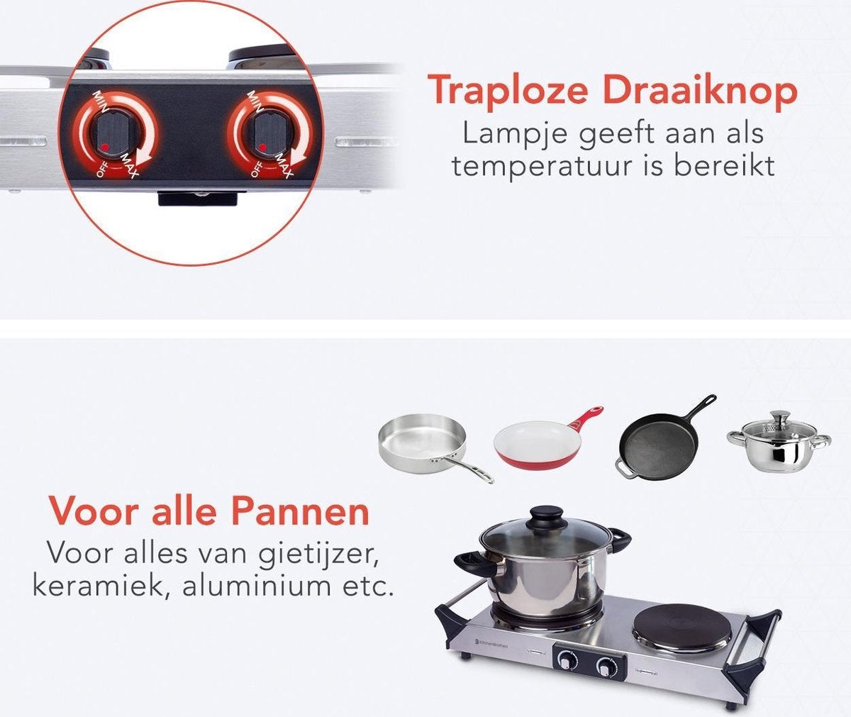 Suchen Sie ein kompaktes und freistehendes Kochfeld? Dann ist dieses KitchenBrothers Kochfeld genau das Richtige für Sie. Das Kochfeld ist mit 2 Ringen ausgestattet und leicht zu verstauen. Ideal für die Zubereitung Ihrer Lieblingsrezepte. Die Griffe des KitchenBrothers Kochfeldes sind hitzebeständig, so dass Sie das Kochfeld während des Kochens leicht bewegen können. Ihre Vorteile ✔ Automatische Abschaltung nach längerer Nichtbenutzung ✔ Thermisch isolierte Griffe Leicht zu reinigen ✔ Leicht zu reinigen ✔ Elegantes Finish aus rostfreiem Stahl ✔ Steuerung der Belüftung ✔ 1500W Leistungsabgabe Leicht zu verstauen Wenn Sie keinen Zugang zu einem Kochfeld haben, aber trotzdem leckere Gerichte zubereiten möchten, ist dieses Kochfeld ideal. Das KitchenBrothers Kochfeld nimmt nur wenig Platz in Anspruch und macht das Kochen einfach. Ideal als (vorübergehende) Lösung oder beim Camping. Schnelles Aufwärmen der Speisen Innerhalb von 7 Minuten haben Sie einen Topf mit 1 Liter Wasser zum Kochen gebracht! Mit den Knöpfen können Sie die Hitze selbst regulieren. Das kleine Kochfeld hat eine Leistung von 1000 W und das große von 1500 W. Sobald Sie Ihre Wahl getroffen haben, heizt der Brenner weiter, bis er die gewünschte Temperatur erreicht hat. Dann erlischt das rote Licht und der Brenner hält diese Temperatur. Auf diese Weise können Sie die Temperatur ganz einfach selbst regulieren und die Kontrolle über Ihr Essen behalten! Ausführliche Mahlzeiten zubereiten Ein-Topf-Mahlzeiten sind oft mit Komplikationen und/oder Einschränkungen verbunden. Mit zwei Brennern können Sie fast so viel kochen wie auf einem Küchenherd! Wählen Sie aus einer breiten Palette von Rezepten und Gerichten. Mit zwei Pfannen ist Ihr Lieblingsgericht im Handumdrehen auf dem Tisch! Hitzebeständige Griffe Dank der seitlichen Griffe rutscht die Pfanne nicht so leicht vom Kochfeld. Das ist auch sehr praktisch, wenn man das Kochfeld verschiebt! Wenn Sie umrühren, bewegt sich die Pfanne oft mit, aber die Griffe halten sie auf. Und dank der rutschfesten Gummifüße steht das Kochfeld sicher. Pfannen rutschen nicht weg Beim Umrühren oder Wenden von Zutaten kann die Pfanne manchmal verrutschen. Damit sie nicht versehentlich vom Kochfeld rutscht, dienen die Griffe als Barriere. Beim Bewegen des Kochfelds bieten sie außerdem zusätzliche Sicherheit, dass die Pfanne nicht abrutscht. Inhalt der Verpackung - Kochplatte (1x) - Handbuch (1x) Spezifikationen: â–¶ Marke: KitchenBrothers Material: Rostfreier Stahl Farbe: Silber â–¶ Gewicht: 4 KG â–¶ Abmessungen: 54,3 x 22,8 x 10 cm â–¶ Kochfelddurchmesser: 185 / 155 mm Anzahl der Kochplatten: 2 â–¶ Zertifizierungen: CE, RoHS, REACH, ERP Überhitzungsschutz: Ja â–¶ Kabellänge: 1,20 Meter â–¶ Eingang: 220-240V, 50/60Hz â–¶ Wattzahl: 1500W + 1000W â–¶ Geeignet für: Camping, Renovierung, Unterricht, Studentenzimmer, und mehr ℹ Tipp: Verwenden Sie keine Pfannen, die viel größer als das Kochfeld sind, da dies zu einer ungleichmäßigen Erwärmung der Speisen führen kann.